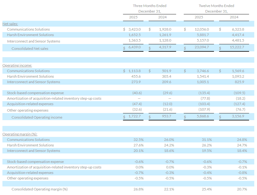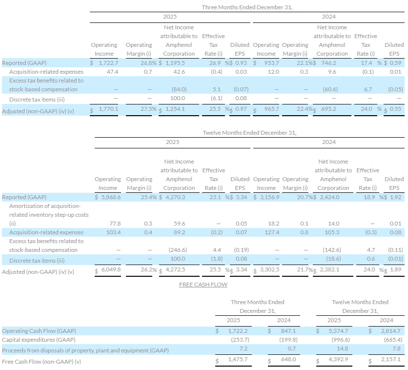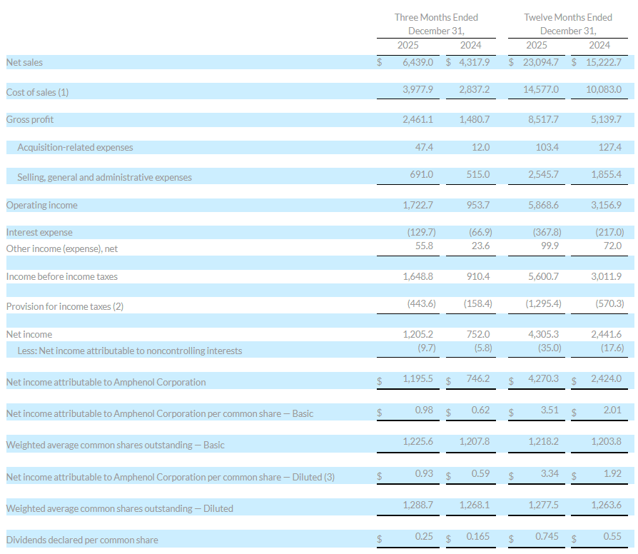 Mr. Norwitt continued, “I am very pleased with the Company’s strong finish to a very successful 2025. The revolution in electronics continues to accelerate, with new innovations creating exciting growth opportunities for Amphenol across each of our diversified end markets. In turn, we have expanded our range of high-technology interconnect products, both through our organic innovation efforts as well as through our successful acquisition program. This expanded technology position coupled with our unique entrepreneurial culture has strengthened our competitive advantage. Our ongoing drive to leverage that competitive advantage and thereby create sustained financial strength has established an excellent base for the Company’s future performance. I am confident in the ability of our outstanding entrepreneurial management team to continue to dynamically adjust to changing market conditions, to capitalize on the wide array of growth opportunities that arise in all market cycles and to continue to generate sustainable long-term value for our shareholders and other stakeholders.”