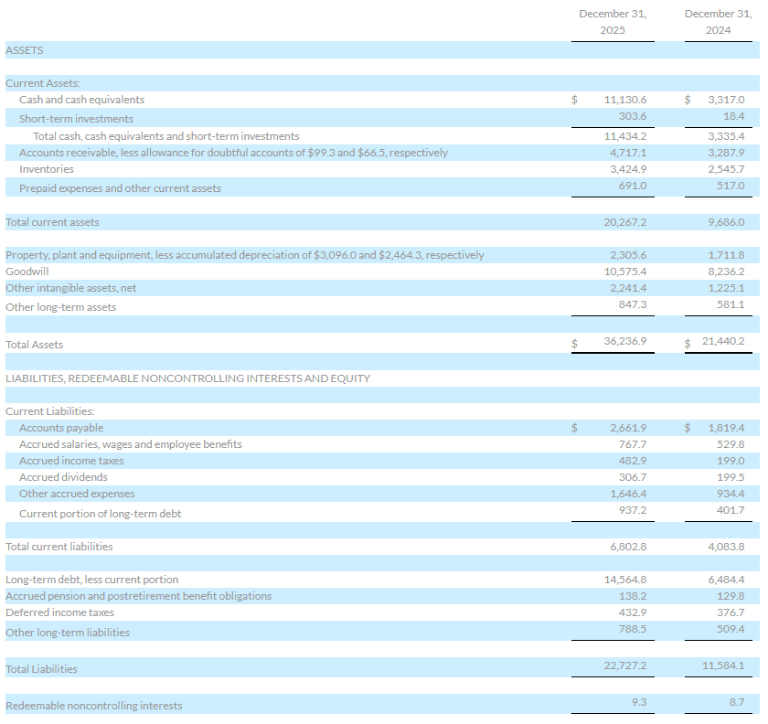 For the twelve months ended December 31, 2025, Cost of sales includes the amortization of acquisition-related inventory step-up costs of $77.8 million ($59.6 million after-tax, or $0.05 per share) associated with the acquisition of the Outdoor Wireless Networks segment and Distributed Antenna Systems business (collectively, the “Andrew Business”) from CommScope that closed during the first quarter of 2025. For the twelve months ended December 31, 2024, Cost of sales includes the amortization of acquisition-related inventory step-up costs of $18.2 million ($14.0 million after-tax, or $0.01 per share) associated with the Carlisle Interconnect Technologies (“CIT”) acquisition that closed during the second quarter of 2024.