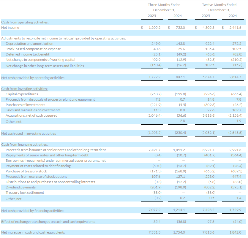 Throughout 2025, the Company continued to deploy its financial strength in a variety of ways to increase shareholder value. During the fourth quarter, the Company purchased 1.3 million shares of its common stock for $171 million and paid dividends of $202 million, resulting in total capital returned to shareholders of nearly $1.5 billion in 2025.
