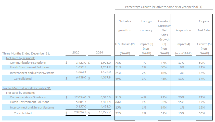 Amphenol remains focused on expanding its growth opportunities through a deep commitment to developing enabling technologies for customers across its served end markets, an ongoing strategy of market and geographic diversification as well as an active and successful acquisition program. To that end, the Company completed five acquisitions during 2025, including the previously announced closing of the Trexon acquisition in November. In addition, on January 12, 2026, the Company announced the closing of its acquisition of CommScope’s Connectivity and Cable Solutions (CCS) business. As previously disclosed, Amphenol expects the CCS business to generate full-year 2026 sales of approximately $4.1 billion and add approximately $0.15 to Amphenol’s 2026 Adjusted Diluted EPS.