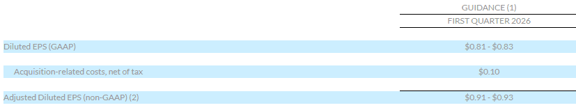 (1) Forward-looking Adjusted Diluted EPS reflected in our guidance excludes certain income and expenses, described above, that are not directly related to the Company’s operating performance. Such items are excluded from our guidance for the forward-looking periods only to the extent that such items have either (i) already been reflected in periods reported and are therefore included in the forward-looking full-year period or (ii) the Company reasonably expects to record such items in the forward-looking periods presented and such amounts are estimable. The Company estimates acquisition-related costs, net of tax in the first quarter of 2026 of approximately $135.0 ($0.10 per share), which primarily relates to the acquisition of the CCS Business.